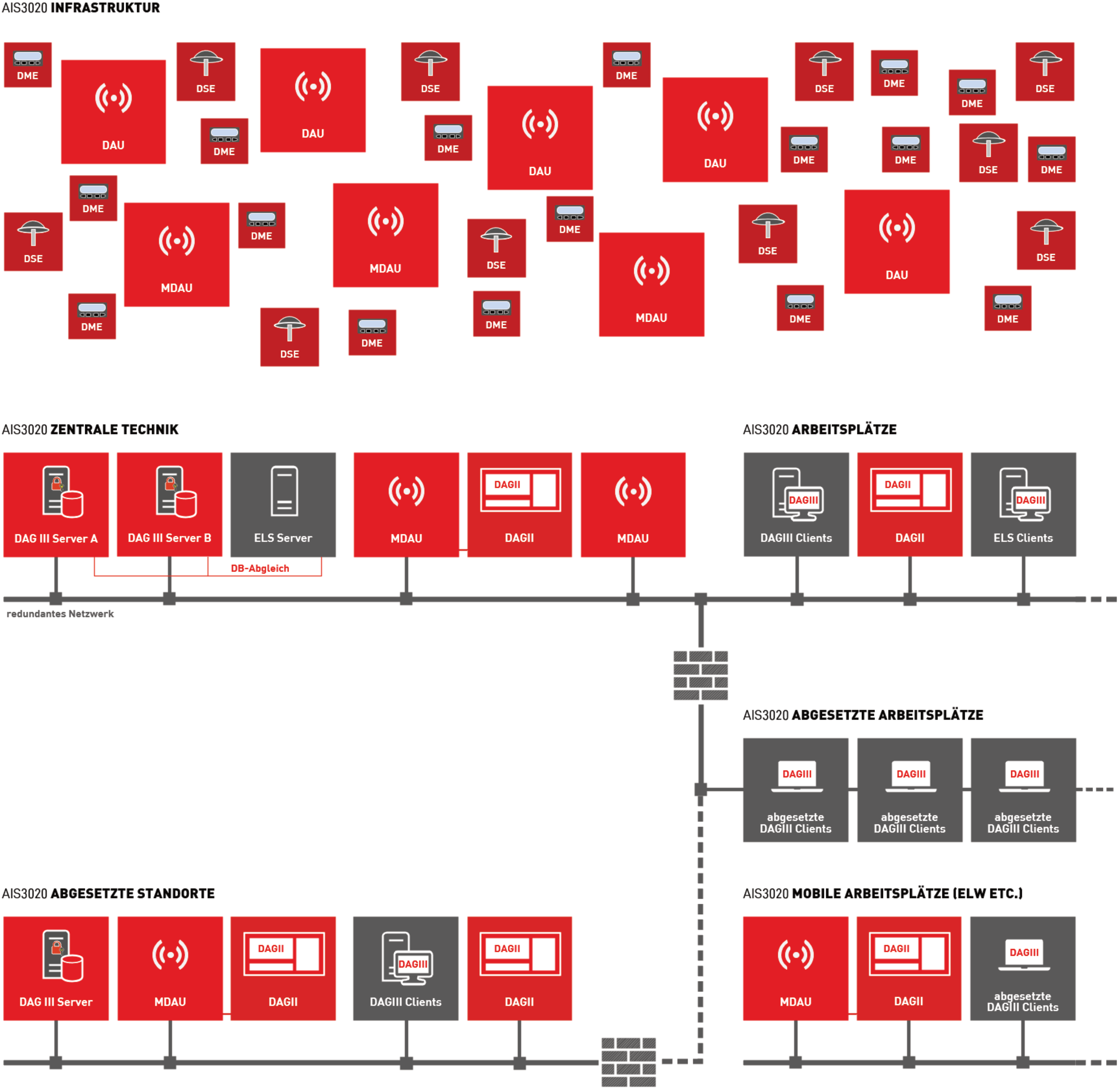 - Abgesetzte Arbeitsplätze als DAGII oder DAGIII für ELW, FEZ oder Lage- und Stabsräume, auf Wunsch mit eigenem MDAU