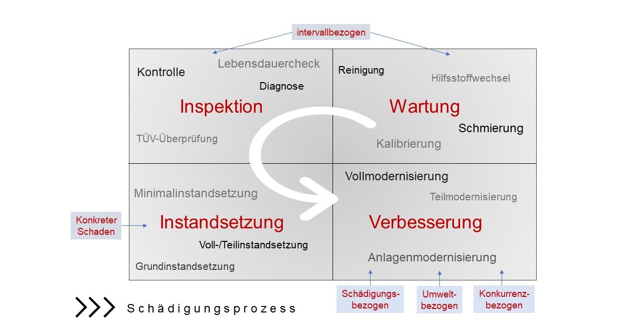 Die Umsetzung unserer Instandhaltungsstrategie basiert auf der kostenoptimierten Durchführung von Wartungen und Inspektionen, Störungs- und Schadensbehebungen sowie Verbesserungen und richtet sich nach den Zielvorgaben der Auftraggeberschaft.